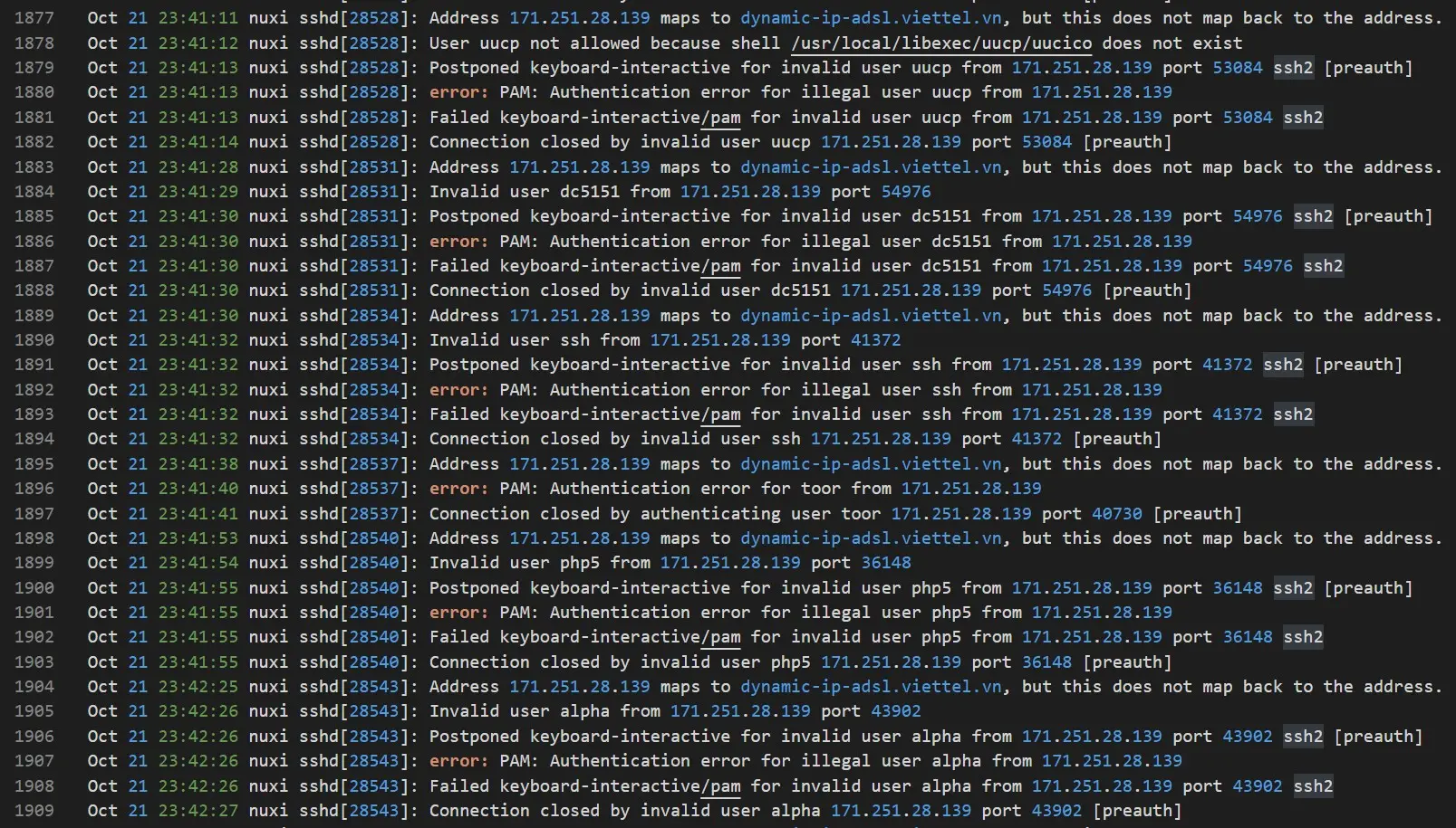 A tegnapi naplóból meg kiderül, hogy vietnámi seggarcok is aktívak ebben a műfajban, akik igazából lehetnek akár ruszki vagy észak-koreai seggfejek is kamu IP-cím mögé bújva. Itt valamivel fantáziadúsabb próbálkozásokat lehet felfedezni, de a behatolási kísérlet ez esetben is sikertelen, mint ahogy eddig minden támadás lepattant a rendszer "védőpajzsáról".